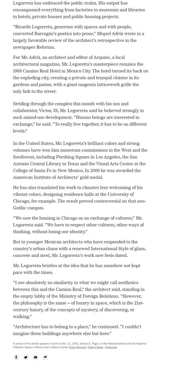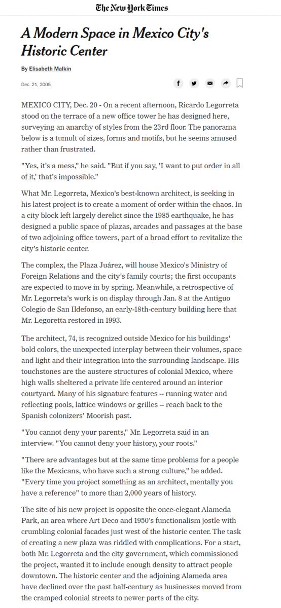 JUÁREZ COMPLEX IN THE NEW YORK TIMES, DECEMBER 21ST, 2005. | NEWS | Legorreta Arquitectos