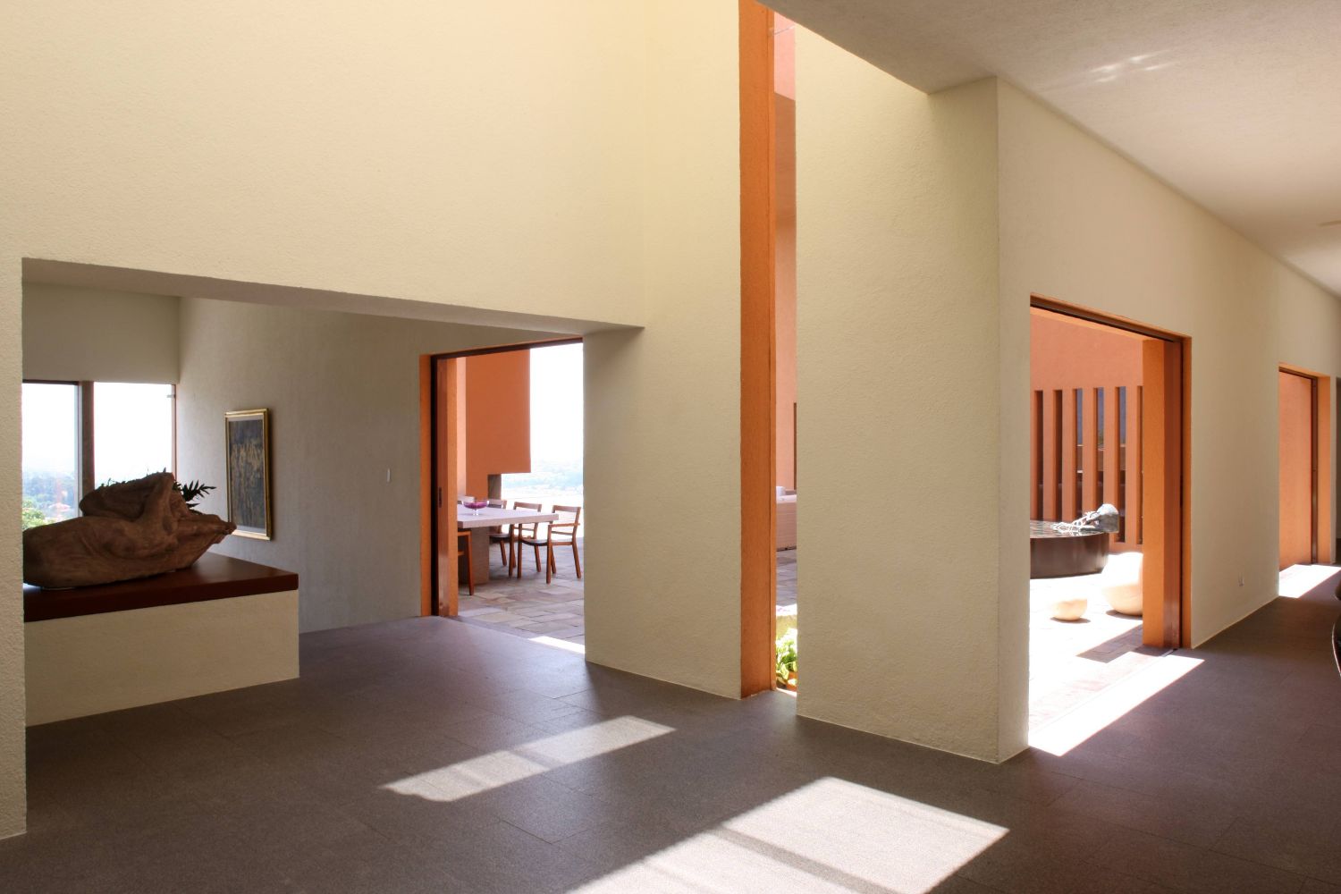 The house is located on top of a hill with a complete view of San Salvador, enjoying great views but particularly a spectacular view of the volcano. Another important point was to take advantage of the natural topography and of the existing vegetation as much as possible. The house is built in a central volume giving main emphasis to frame the panoramic view of the city in the main areas such as living and dining rooms, bedrooms, however the discovery of the house from the access of the street shows us a very close relationship between interior and exterior; from any point of the house, there are beautiful views of gardens, patios and fountains. The house has covered and uncovered terraces that are an integral part of the familys life in the house; the climate allows a great interrelation of exterior and interior spaces. One important element is the terrace next to the swimming pool as it is oriented towards the south and the city. The interior of the house has a great gallery in the ground floor that allows to distribute the spaces in a lineal form towards the living and dining room, covered terrace, family living room, kitchen and services area, as well as direct us toward the great stairway in order to get to a higher floor where the bedrooms, a TV room and a studio are located. Materials of the region are incorporated to the project in order to make more suitable the relationship with the environment. The house is designed with rustic walls, wooden floors, marble and other type of stones. The color of the house played an important role since we tried to frame the house in the green environment of the context.