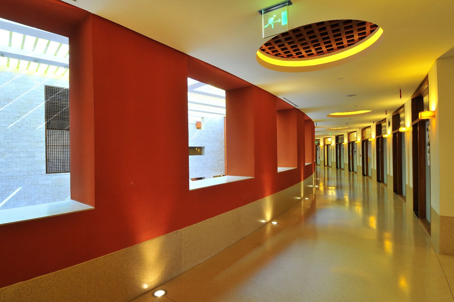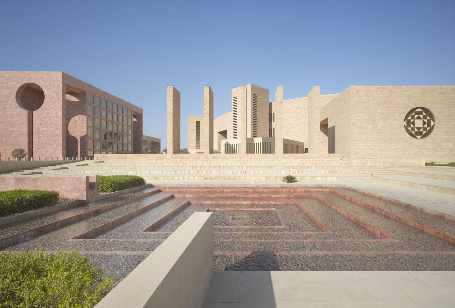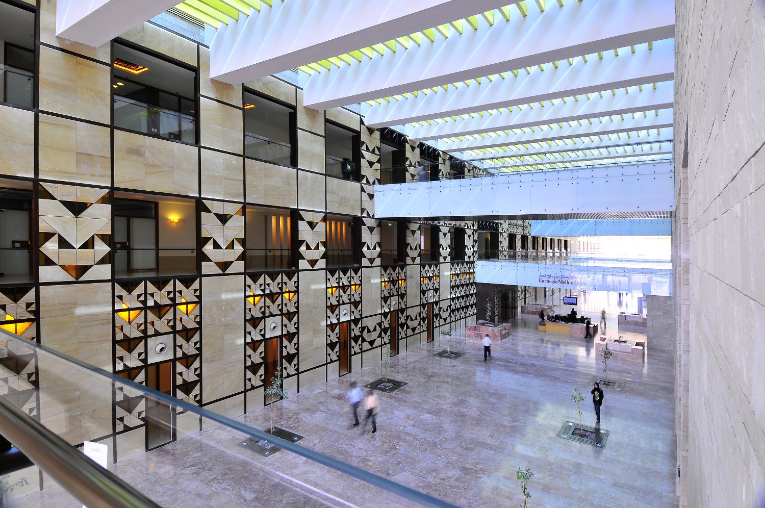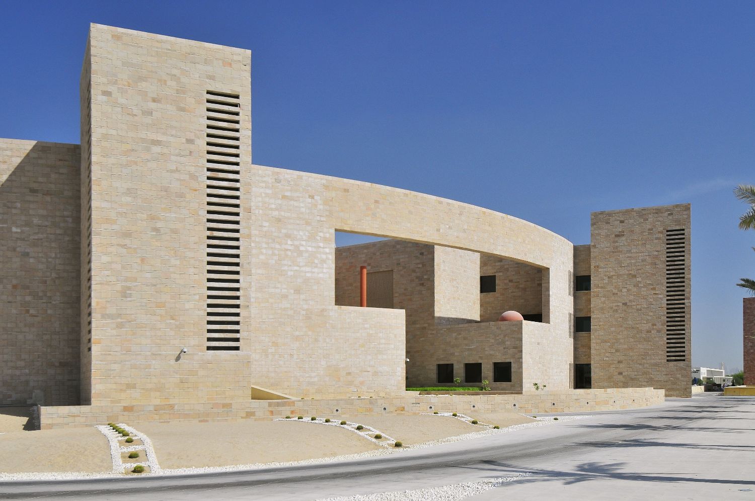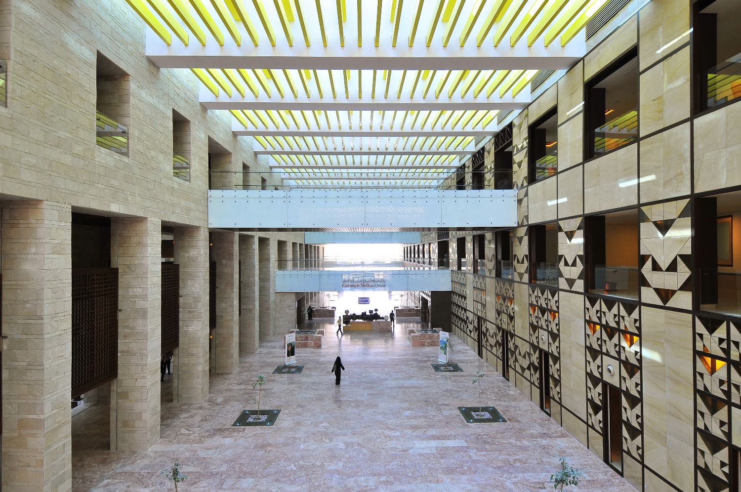 The Carnegie Mellon Business and Computer Science College is located on a site crossed by one of the main pedestrian promenades (Green Spine) of the Master Plan. This situation called for a unique solution where the Green Spine had to pass through the building. The project has been developed as a rectangular building along the north side of the promenade and a semicircular building on the south side that creates, in the center, an atrium connected to the Green Spine. Both parts of the building are connected to each other by bridges on the upper levels over the Green Spine while the ground floor remains open for pedestrian traffic. The rectangular part of the building and the circular one were designed as a series of volumes which house the classrooms, the laboratories and the lecture halls and are separated from each other by outdoor courtyards. This succession of indoor and outdoor spaces creates an environment where teachers and students can interact. Offices are located along the main circulations except for the administration area which is located around a private courtyard. Special areas like the food court, the library and the lounges are in direct relation with the central atrium. This space like the Green Spine and the courtyards is covered at roof level with pergolas. Instead of blocking out all sunlight, these elements of shading play with it differently according to the time of the day.