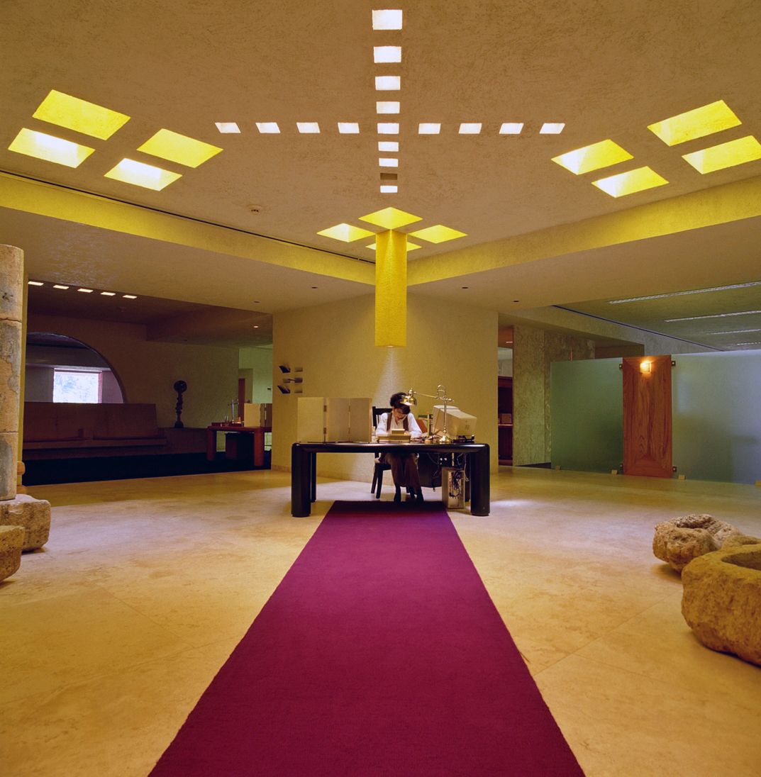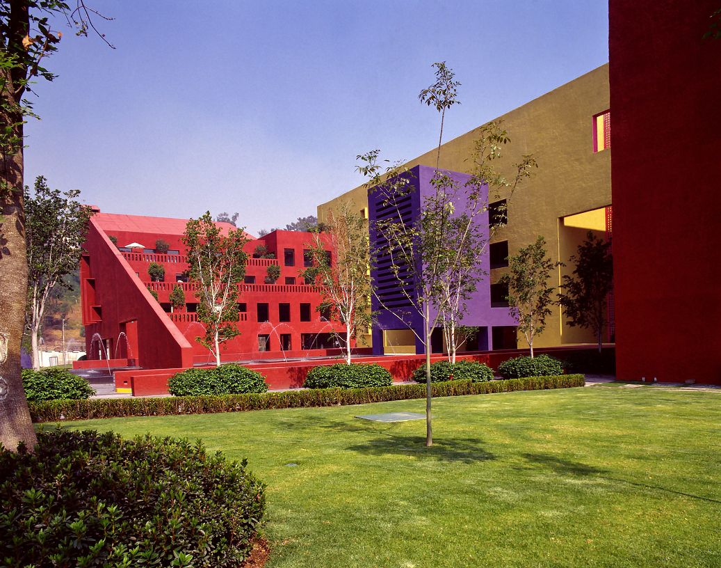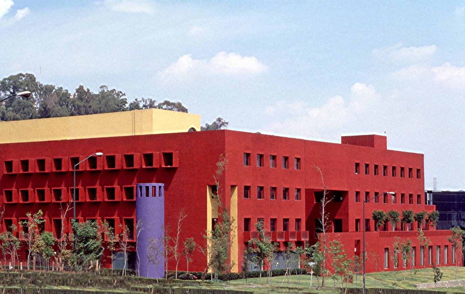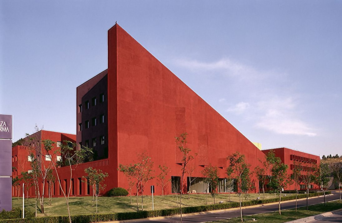 Plaza Reforma, an office building space for rent, is located in the area of Santa Fe, in the outskirts of Mexico City. The main access for cars and pedestrians is through a square or forecourt with a fountain, a carriage gateway and a tall purple tower marking the axis and the building entrance. The offices consist of five separate buildings, each designed in form and image that provides a unique characteristic to each one of them. The design simultaneously allows the building to be occupied by one or several tenants. The areas are designed to have natural light and views to the spacious gardens and private courtyards. Each block is connected by a circulation containing the elevators, stairs and services. This architectonic solution provides the office building with an elegant and human environment in an attempt to create optimum working conditions for the occupants. The complex is full of vibrant colors, playful shapes and spaces, quintessential symbols of contemporary Mexican Architecture.