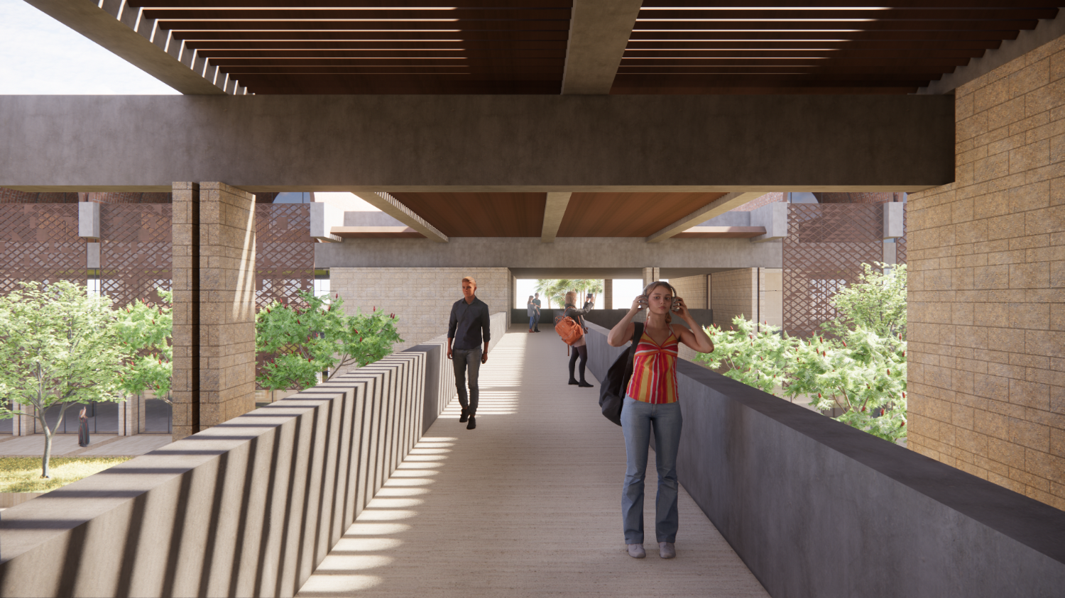 Finally, the campus features a bridge connecting two of the buildings, designed to offer shade and comfort to students as they move between them. The complex is complemented by flexible coworking spaces and outdoor areas where students can rest or work.