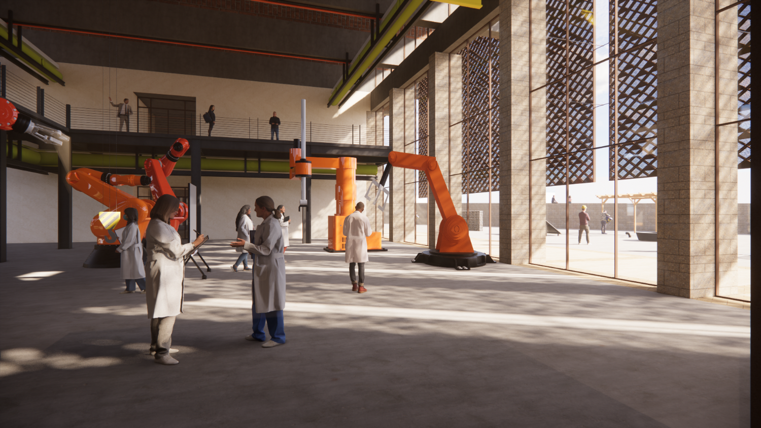One of the buildings houses the robotics lab, while another is dedicated to fabrication and features an exterior space where students can display and build the projects they develop inside. A digital lab was also included, designed with great flexibility to adapt to future needs due to the ever-changing nature of technology. In addition, a coworking space was created to connect students with industry professionals, fostering collaboration and shared learning.