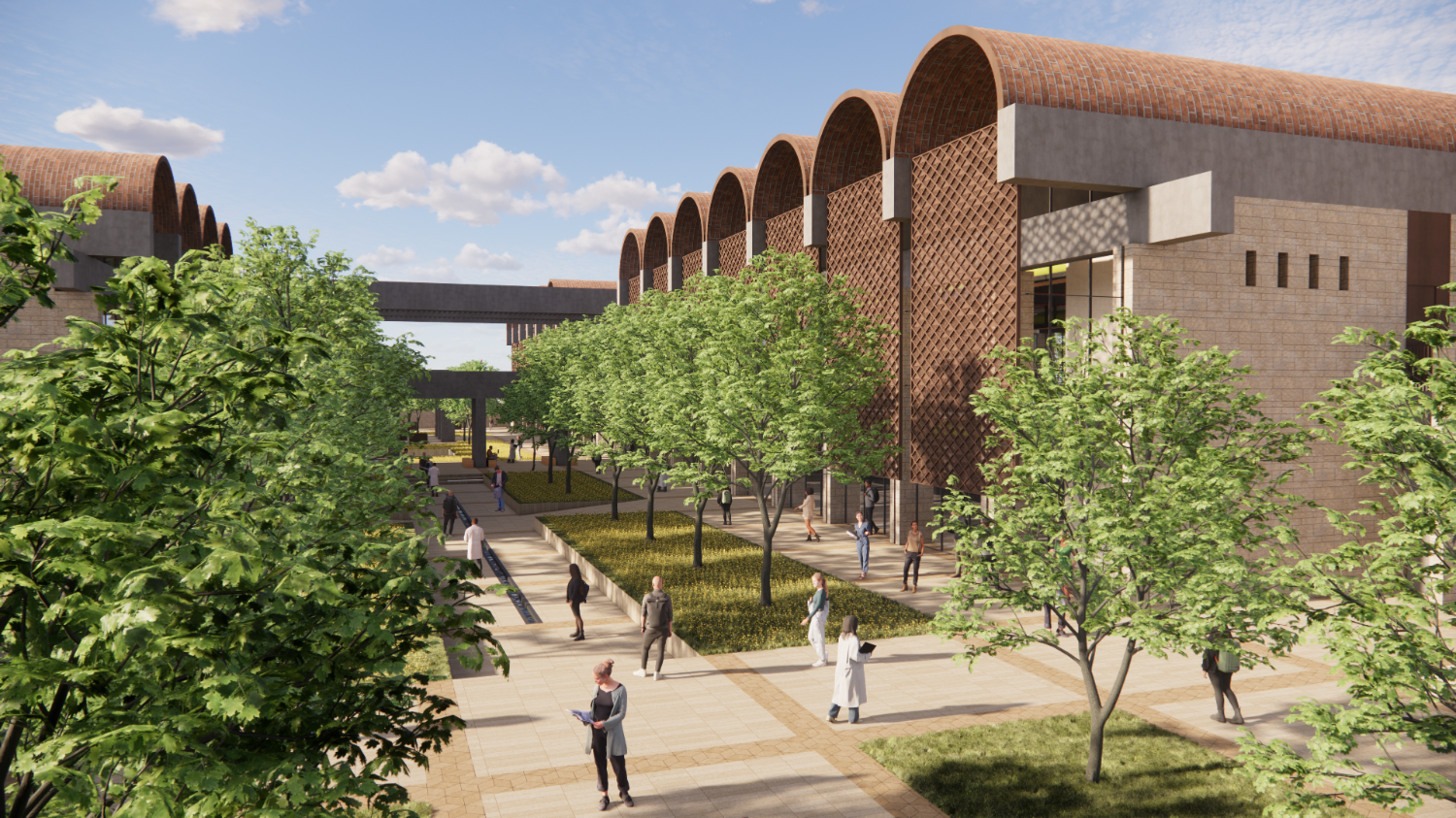 Inspired by this idea, we designed a "green spine," a central space that visually connects the four buildings. The internal glass facades allow students to observe the activities in the labs, promoting transparency and collaboration between disciplines.