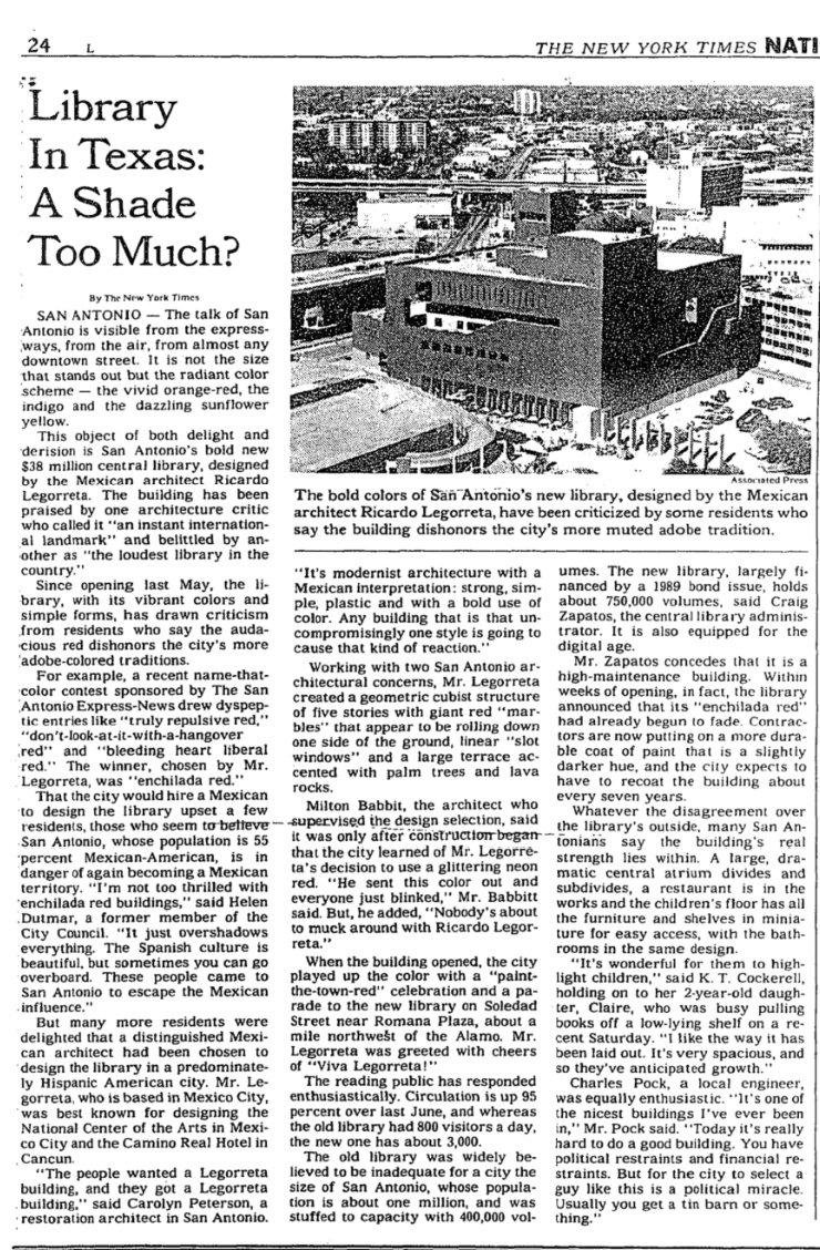 BIBLIOTECA DE SAN ANTONIO EN EL NEW YORK TIMES, NOVIEMBRE 26, 1995. | NOTICIAS | Legorreta Arquitectos