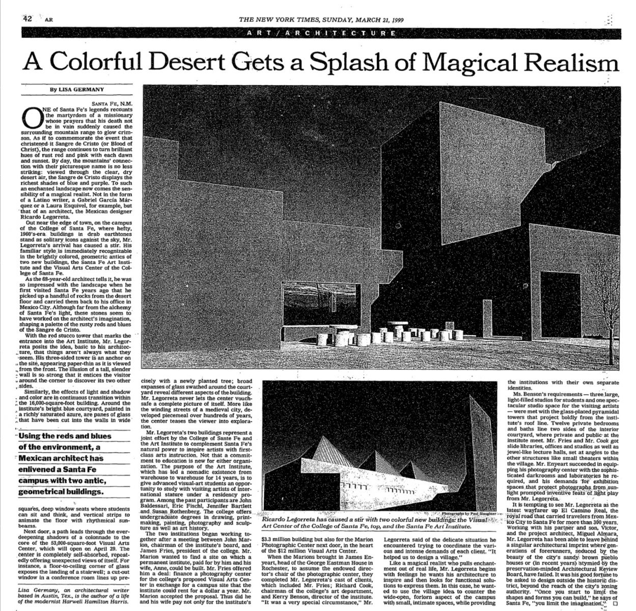 CENTRO DE ARTES VISUALES DE SANTA FE EN EL NEW YORK TIMES, 21 MARZO, 1999. | NOTICIAS | Legorreta Arquitectos