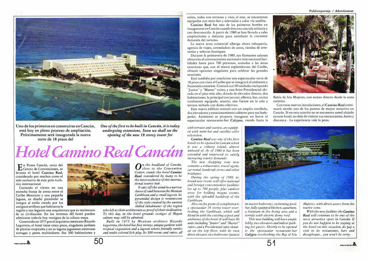 HOTEL CAMINO REAL CANCÚN EN REVISTA "CAMINOS DEL AIRE" DE MEXICANA DE AVIACIÓN, NOVIEMBRE 1988