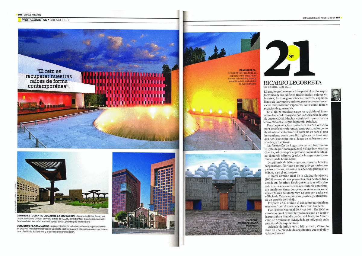 PUBLICACIÓN EN REVISTA OBRAS, AGOSTO 2012. | NOTICIAS | Legorreta Arquitectos