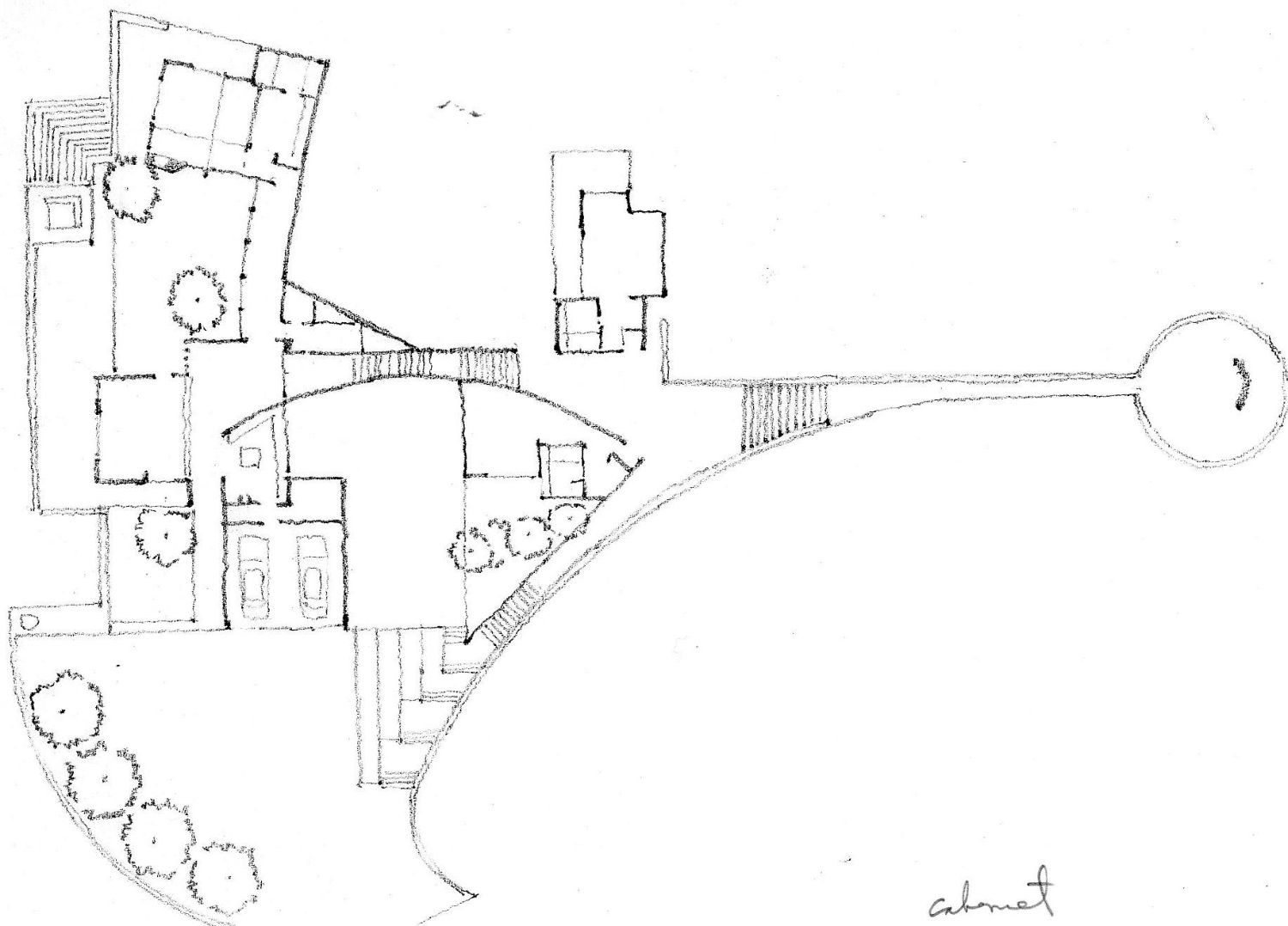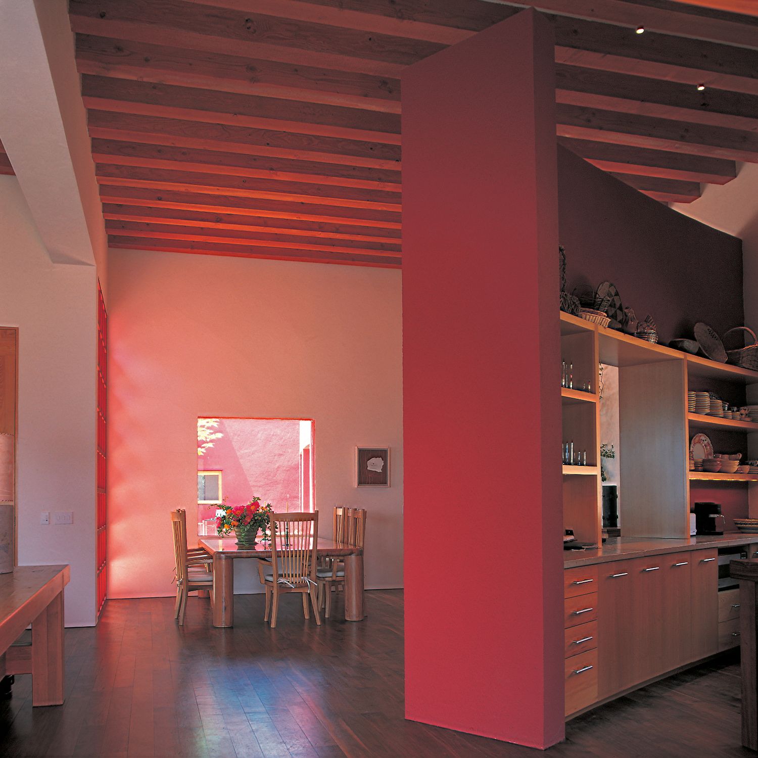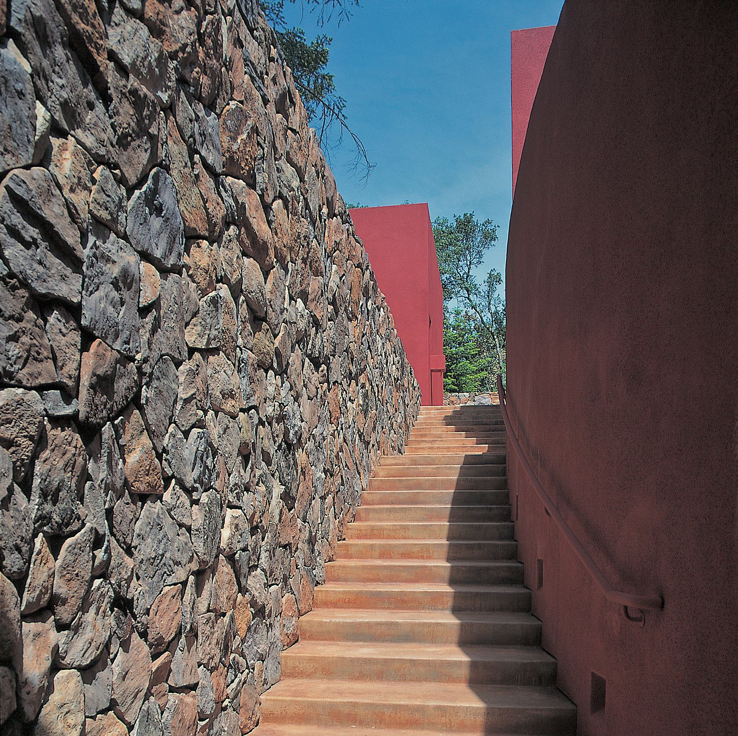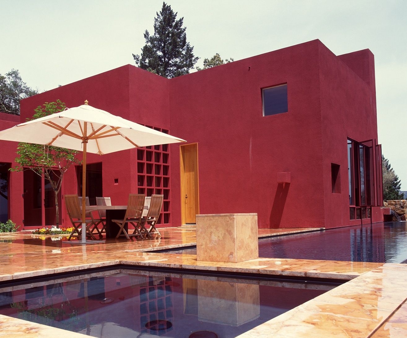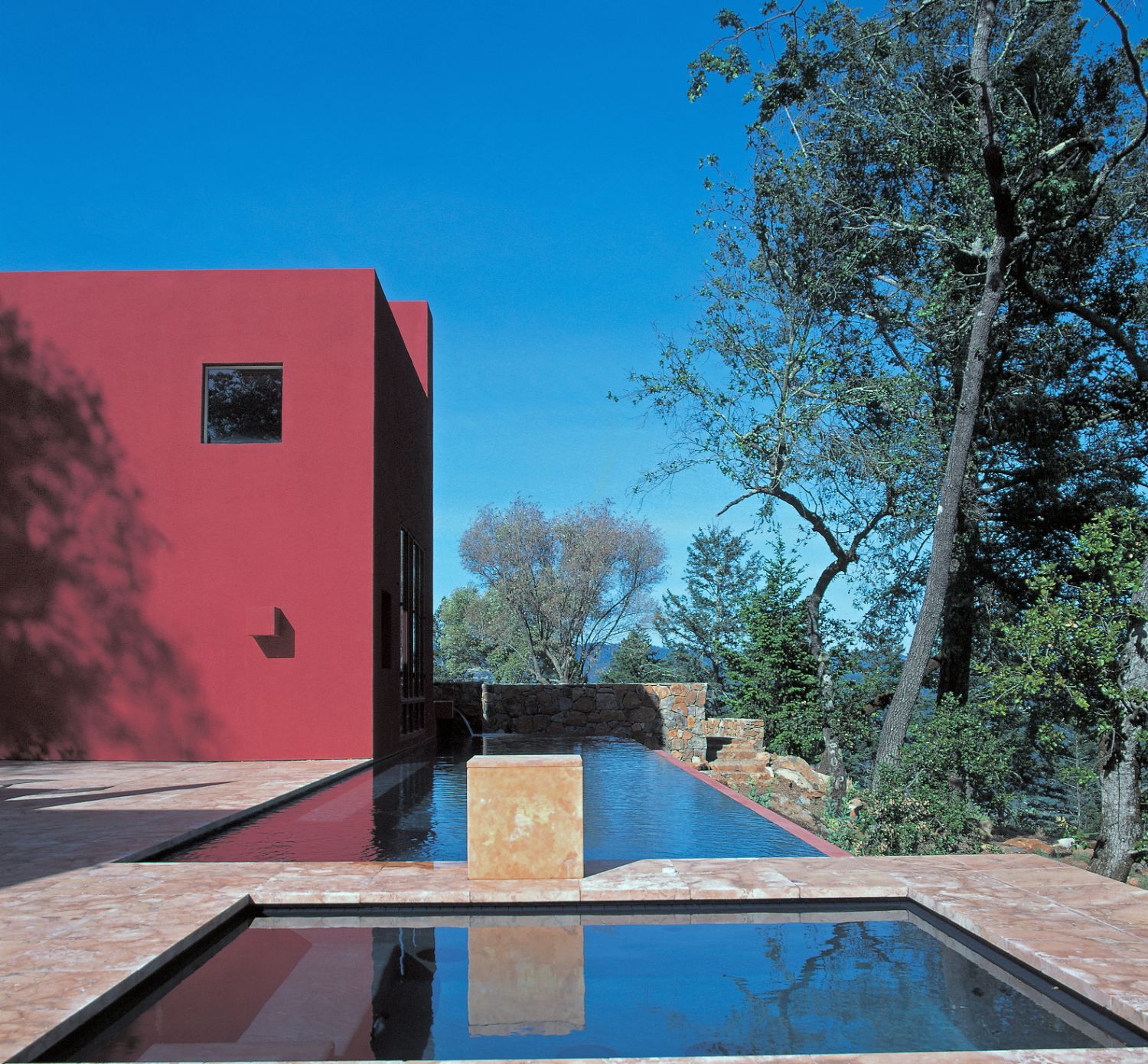La casa se encuentra en la cima de una hermosa loma en Santa Helena, justo al norte del Valle de Napa, en la zona del vino. El lugar está rodeado por un pequeño bosque y viñedos. Los clientes querían una casa con una escala muy humana que se adaptara a un estilo de vida informal. La casa tiene sala, recámara principal, terraza con alberca y dos habitaciones para huéspedes. Se quiso que la casa se integrara en el bosque lo más posible. La solución que se dio fue la de dividir los diferentes elementos de la casa en cuatro pabellones principales. Esta solución permitió que se crearan diferentes ambientes en cada uno, además de poder aprovechar las diferentes vistas del terreno. Las conexiones entre los diferentes pabellones se diseñaron de una manera tal que fuera realmente interesante el recorrido y no un simple pasillo. La circulación que conecta la sala y la recámara principal se convierte en una galería que se abre a la terraza y a la alberca. La circulación que une al pabellón principal con las dos habitaciones para huéspedes se solucionó con un par de muros curvos que se integran con el terreno y se convierten casi en piezas esculturales. Estos muros se introducen en los diferentes pabellones, provocando una fuerte relación entre el interior y el exterior. En el exterior se combinaron los muros de piedra con los volúmenes rojos de la casa y se estudiaron los niveles para integrarlos completamente al sitio. Se escogió un color rojo intenso, similar a la tierra del terreno y se le llamó rojo Cabernet, en alusión al tipo de uvas que crecen en la propiedad. En el interior fue una preocupación constante el diseñar espacios íntimos de donde se pudieran disfrutar las maravillosas vistas, que se encuadraron con ventanas estudiadas más desde el interior que en fachada. Se tuvo la oportunidad de seleccionar todo el mobiliario y hasta diseñar varias piezas, lo que creó una unidad entre paisaje, arquitectura e interiores. Varios muebles son de origen mexicano y tuvieron que ser enviados a los Estados Unidos.