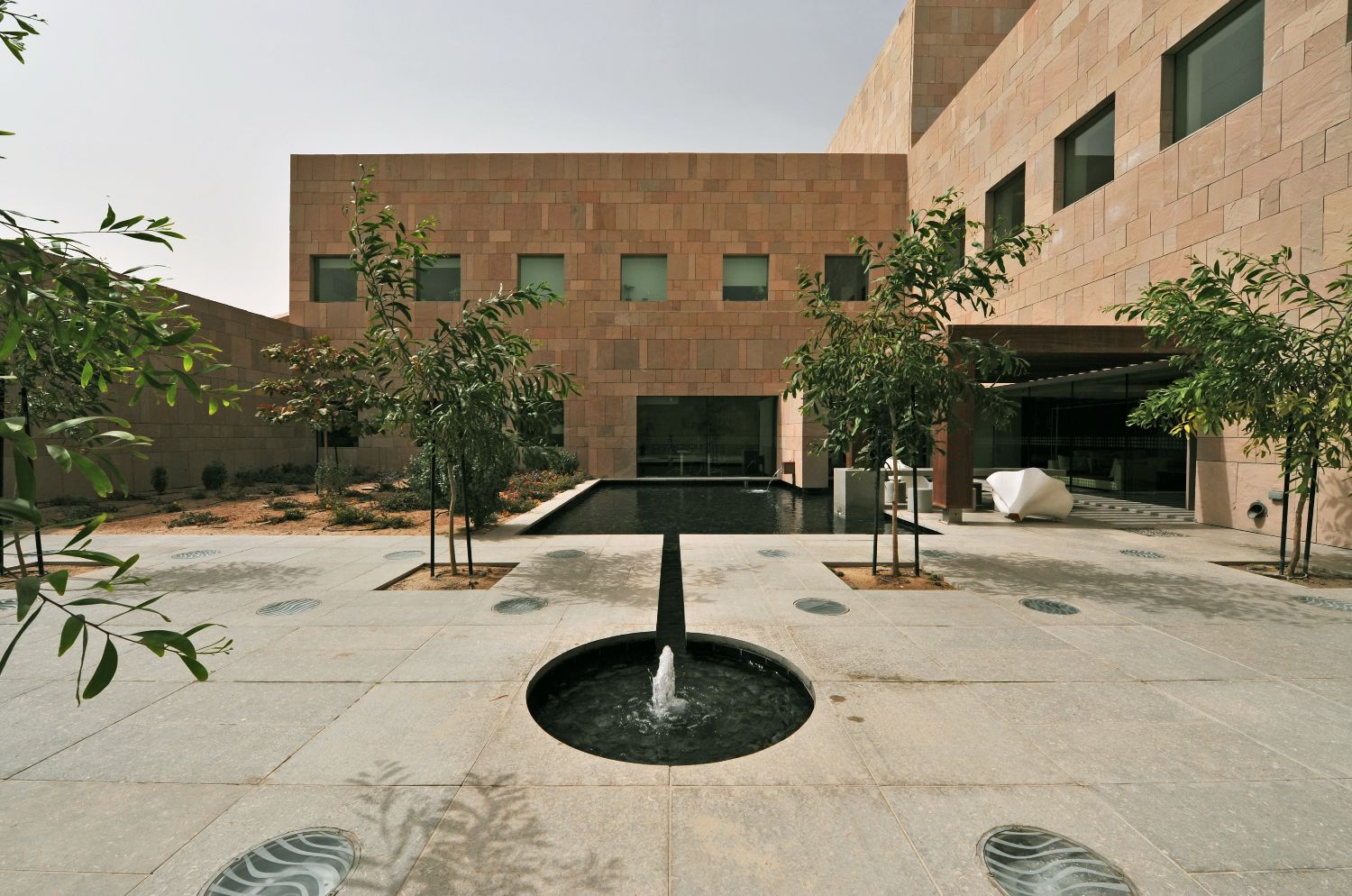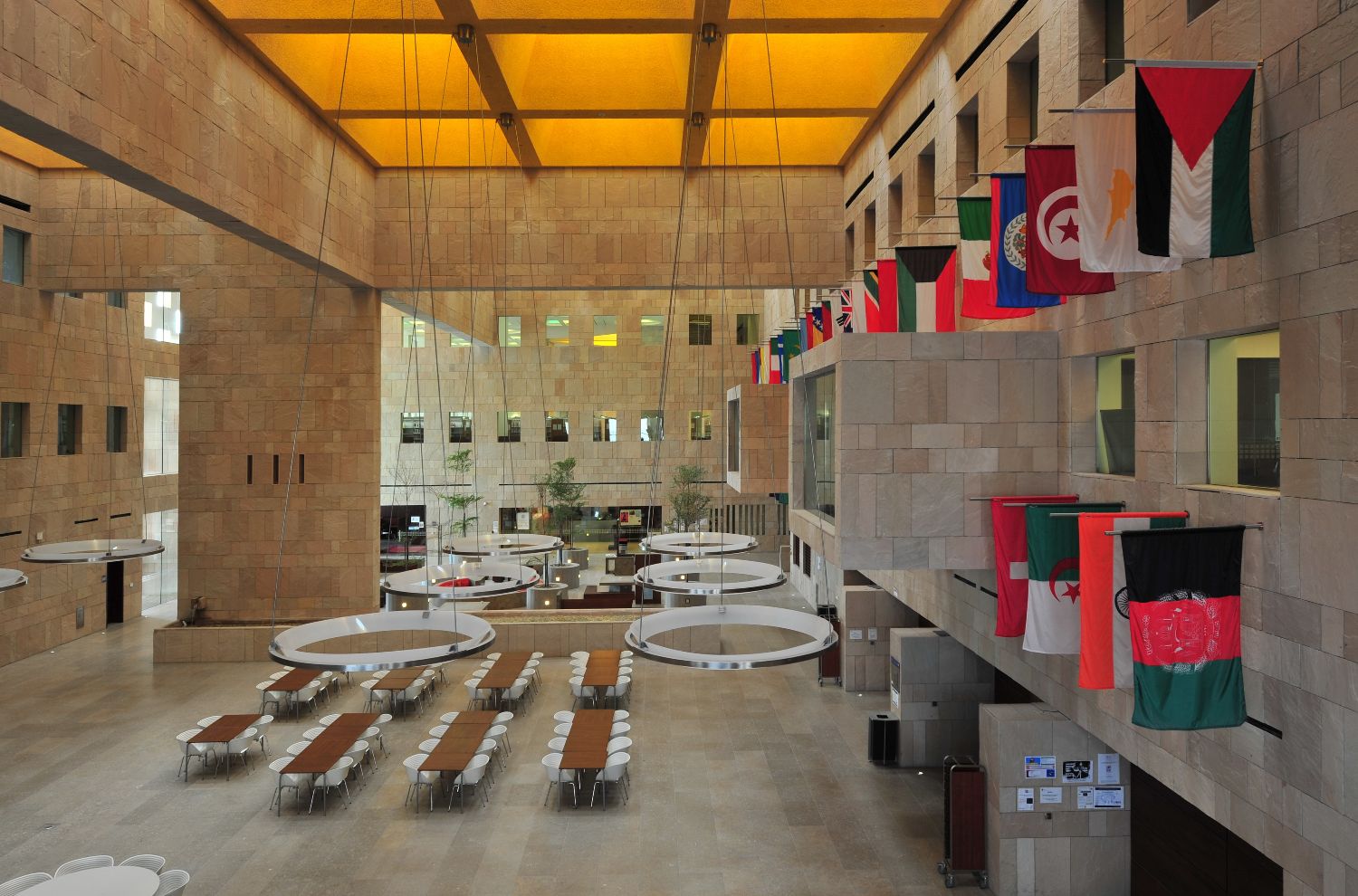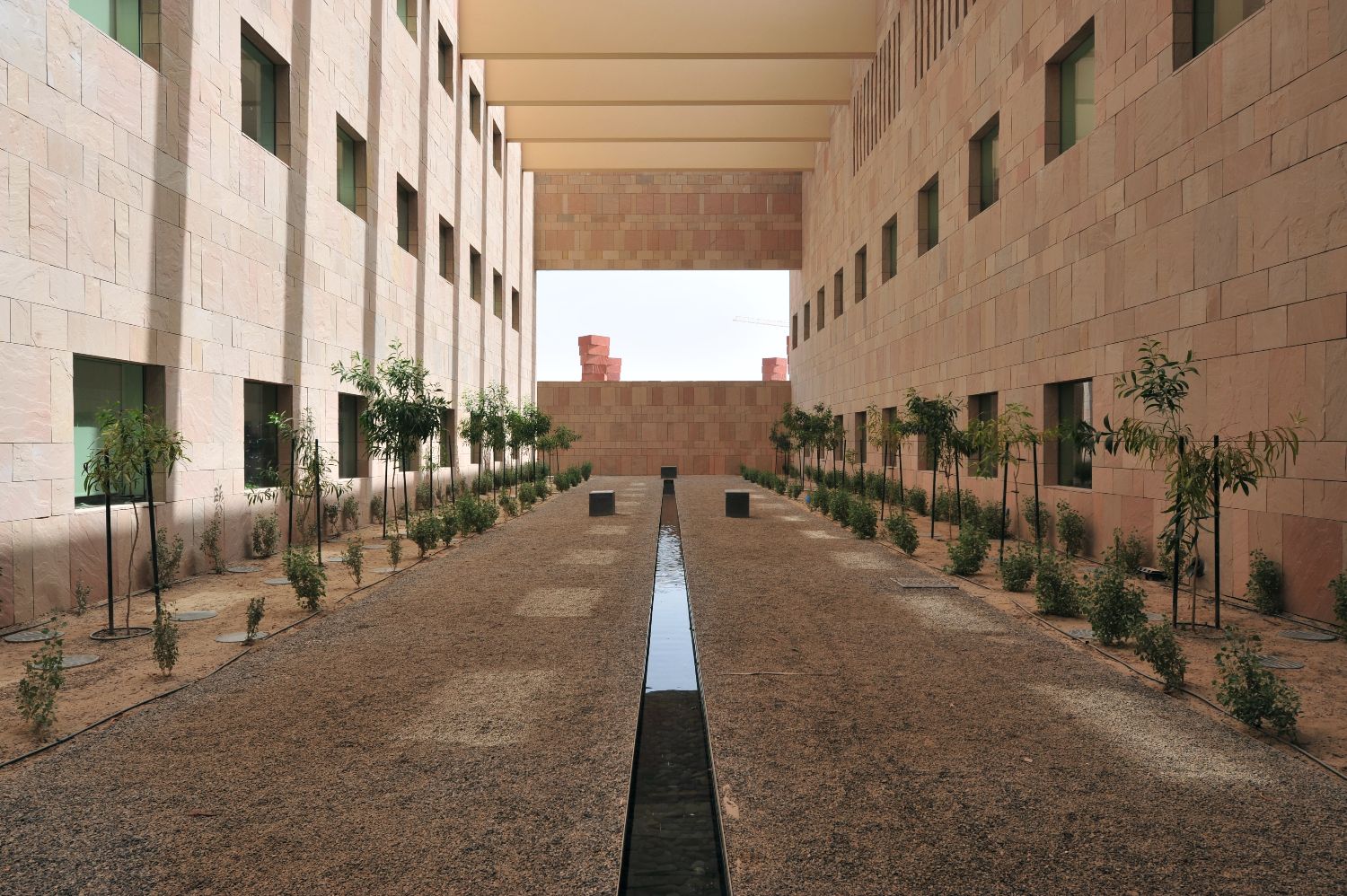 La Escuela de Diplomacia “Edmund A. Walsh”, de la Universidad de Georgetown en Qatar, se integra en el lado Norte de la UHBK (Universidad Hamad Bin Khalifa). El edificio adyacente al Oeste es la biblioteca central, y al Suroeste está el Centro Estudiantil, que tambié fue diseñado por LEGORRETA®. En el Sur está ubicada la “ruina de la herencia” y un parque con una fuerte conexión visual y conceptual lograda a través del diseño del paisaje y la orientación del edificio. El principio de diseño consiste en romper con la construcción monumental para ir hacia una escala más humana, logrando una atmósfera más hogareña en la que los estudiantes se sientan cómodos. El edificio es una composición de varios departamentos pequeños para dar la sensación de estar en casa. Todas las partes del edificio están conectadas con las áreas comunes, que son la base de La Escuela de Diplomacia. La entrada se conecta con la “Green Spine” del trazo del campus hacia el Sur por una agradable zona peatonal con esculturas a lo largo del camino. Los patios ajardinados y los espacios de los atrios entremezclados a través del complejo del edificio crean un relajado ambiente, promoviendo así una sensación de intimidad y ofreciendo tranquilidad a la agitada vida universitaria. Se puso especial atención al ambiente al aire libre. Las características del agua restauran y ventilan los espacios alrededor de ellos. Un jardín de cactáceas se sitúa a lo largo de la fachada norte y marca la transición entre el desierto y las áreas formalmente diseñadas y los patios facilitan funciones adyacentes y se convierten en agradables zonas de transición.
