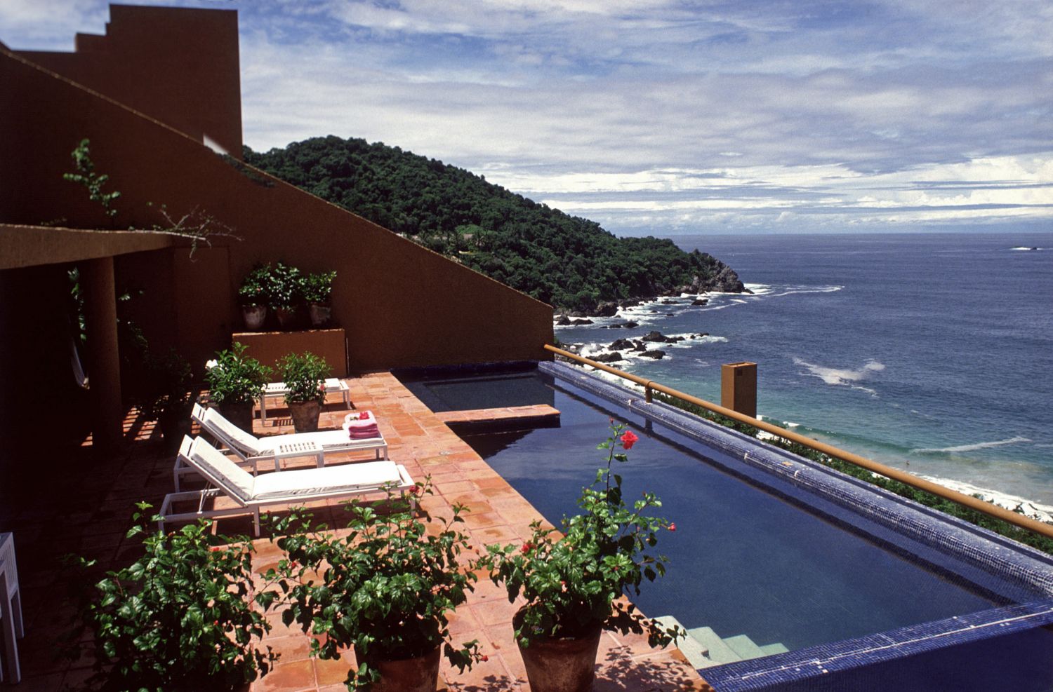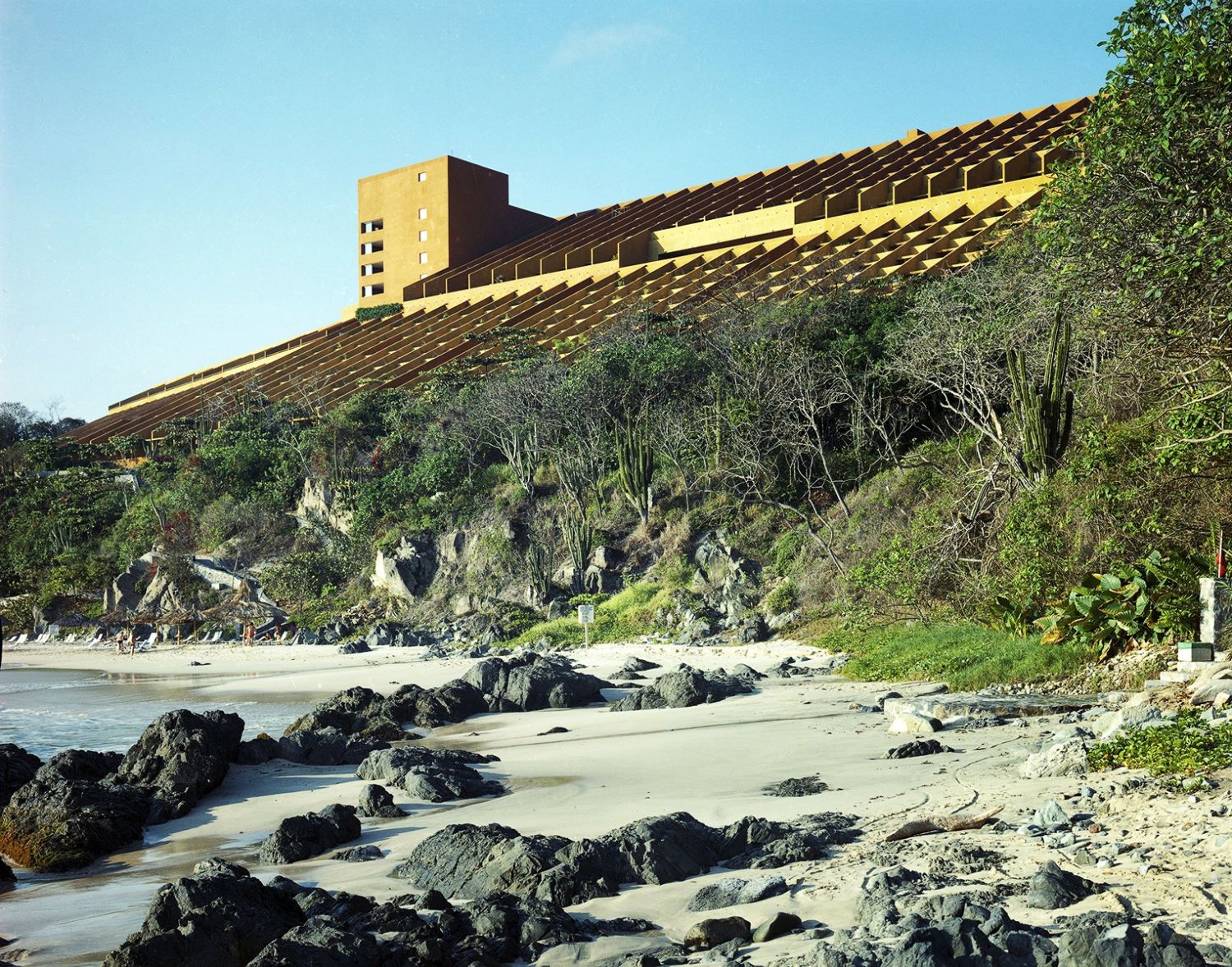 El Hotel Camino Real Ixtapa, ahora Las Brisas, fue una experiencia única. Empezó con la selección del terreno, misma que se hizo desde el mar. Posteriormente, Ricardo Legorreta lo recorrió y su comentario fue: “Es un terreno maravilloso, requiere de un hotel excepcional”. Cuando un hotel tiene una personalidad tan fuerte, la filosofía del proyecto es consecuencia de esa personalidad. En este caso, el imponente mar, la extraordinaria playa y la montaña, fueron la base del concepto. El hotel debía adaptarse a la topografía, a la vegetación, obtener las ventajas del clima y de la brisa y por último, aprovechar las diferencias de nivel para crear su forma. En resumen el hotel debía ser un proyecto para ese terreno en particular y para una forma de vida que sólo se diera en esas condiciones topográficas y climáticas. Las habitaciones se adaptaron al terreno con orientación, niveles y pendientes óptimos para su construcción, utilizando el techo de las habitaciones como terraza de las superiores. La vida natural, los grandes espacios, la brisa y el mar, siguen siendo el tema en los espacios públicos. La vida en las costas del Pacífico es de exteriores; así pues, se dio a ello especial atención. A medio nivel entre el acceso y la playa se localizó el solárium, un conjunto de muros, acueductos, techos, fuentes y árboles que ofrecen la oportunidad de tomar el sol, beber, comer y nadar en medio de esculturas y juegos de agua, experiencia totalmente diferente a la tradicional alberca del hotel de playa. La playa se dejó virgen. Sin muebles, muros y construcciones que la deformaran, aquí la vida es plenamente natural. Techos de palapa y arena logran la integración total de la naturaleza. El terreno y la filosofía de vida ofrecen la oportunidad ya olvidada del placer de caminar, deambular y meditar en un ambiente mágico. Los diferentes lugares están comunicados entre sí por escaleras, veredas y andadores y para quien desea caminar menos, carros eléctricos y elevador a la playa, mismos que permiten una comunicación rápida y cómoda. Por último, cabe mencionar que el Hotel Las Brisas es concebido como Ricardo Legorreta imaginó el México contemporáneo debía ser: fuerte, amable, romántico y lleno de espacio, color, luz y calidad de espíritu.
